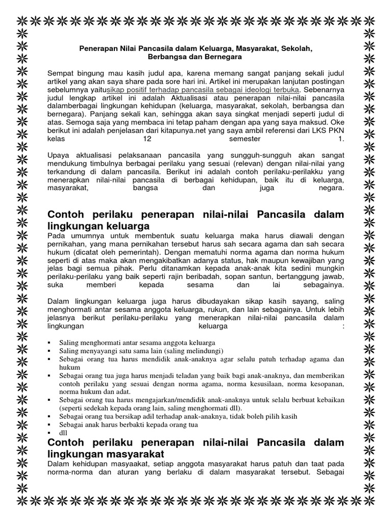Penerapan Nilai Pancasila Dalam Keluarga Masyarakat Sekolah Bangsa Dan Negara