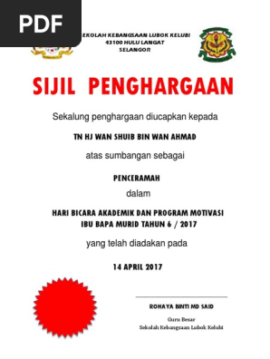 Sijil Penghargaan Kepada Penceramah Docx Document