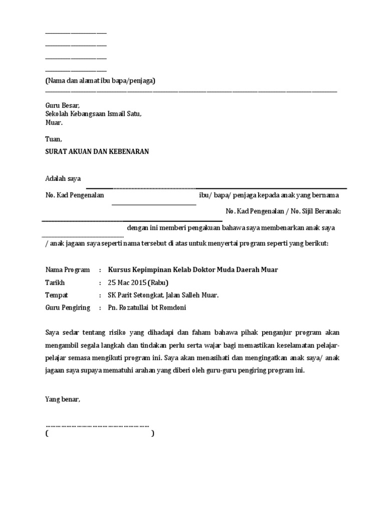 Contoh Surat Kebenaran Ibu Bapa Untuk Menyertai Program