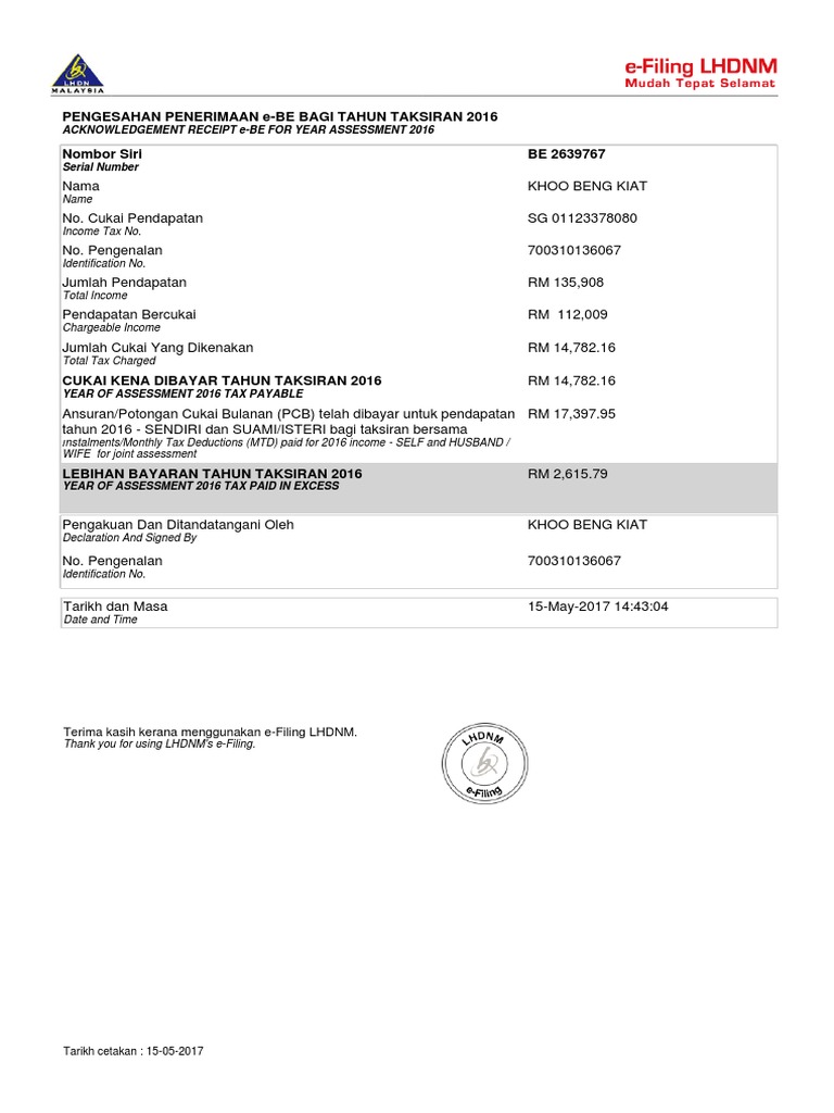 Pengesahan Penerimaan E Be Bagi Tahun Taksiran 2016