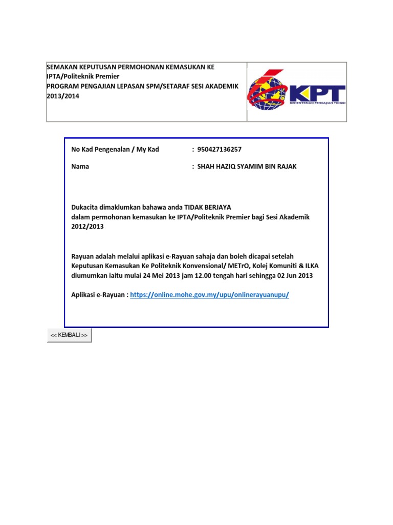 Semakan Keputusan Permohonan Kemasukan Ke Ipta Tevt Ilka Ahmad Faizar S Weblog
